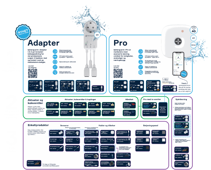Waterguard+ gir trygg og enkel lekkasjesikring for både boliger og næringsbygg. Med Adapter-serien for fleksible installasjoner og Pro-serien med avansert styring og integrasjon, får du norsk kvalitet, 10 års garanti og 24/7 kundeservice – alt i ett komplett sortiment.